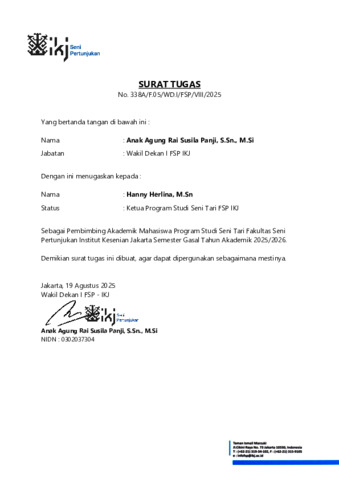 Herlina, Hanny Surat Tugas Pembimbing Akademik Hanny Herlina Gasal 25-26. Institut Kesenian Jakarta.