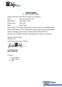 Nurmascahyo, Galih (2026) Surat Tugas Pembimbing Akademik. Fakultas Seni Pertunjukan, Prodi Seni Musik, Institut Kesenian Jakarta. (Unpublished)