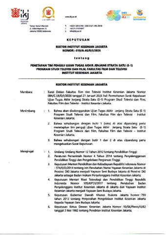 2026 R - 010 SK Penetapan Tim Penguji Ujian Tugas Akhir Jenjang Strata Satu (S-1) Program Studi Televisi dan Film Fakultas Film dan Televisi Institut Kesenian Jakarta.rev.pdf Download (4MB) | Preview |