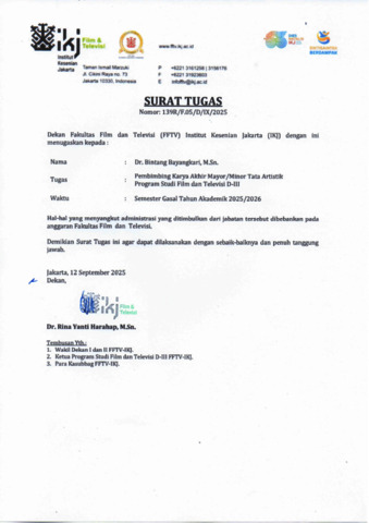 bayangkari, bintang Surat Tugas Pembimbing Karya Akhir Semester Gasal Tahun Akademik 2025/2026 Program Studi Film dan Televisi D-III. Fakultas Film dan Televisi -IKJ. (Unpublished)