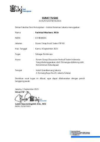 2025 D.FSP - 357A Surat Tugas Pembicara FGD Festival Teater Indonesia.pdf Download (772kB) | Preview |