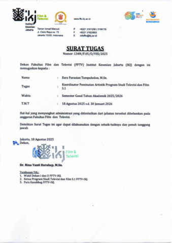 parasian, esra 2025 D - 134N Surat Tugas KP/PA Prodi S.1 Semester Ganjil 2025/2026 a.n. Esra Parasian Tampubolon, M.Sn. Fakultas Film dan Televisi-Institut Kesenian Jakarta. (Unpublished)